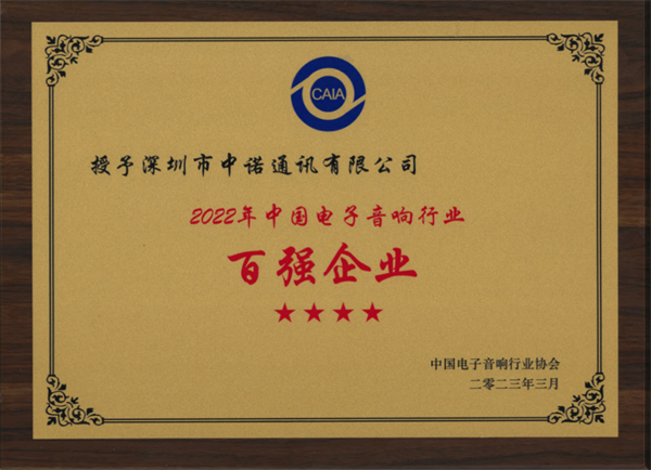 據悉,該榜單以行業企業2022年的企業生產總額、營收數據、企業估值等作為入圍標準。入選企業均為電子音響行業內的佼佼者與領軍者,此次榮登行業百強榜單是市場對中諾通訊的充分肯定。